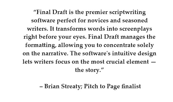 Included in the judging is an evaluation of the script’s formatting. A script that is not properly formatted will not be considered in the film industry and will not advance in Pitch to Page. A writer who uses Final Draft has an advantage over writers who don’t, as Final Draft software is the industry standard for screenplays. Screenwriters who use it present a professional script to potential buyers.