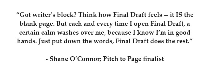 All finalists receive the software as part of their Pitch to Page prize package. Those who didn’t have Final Draft or the latest version now have the tools to improve their screenwriting presentation.